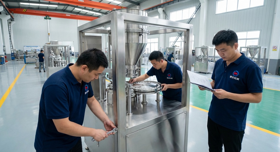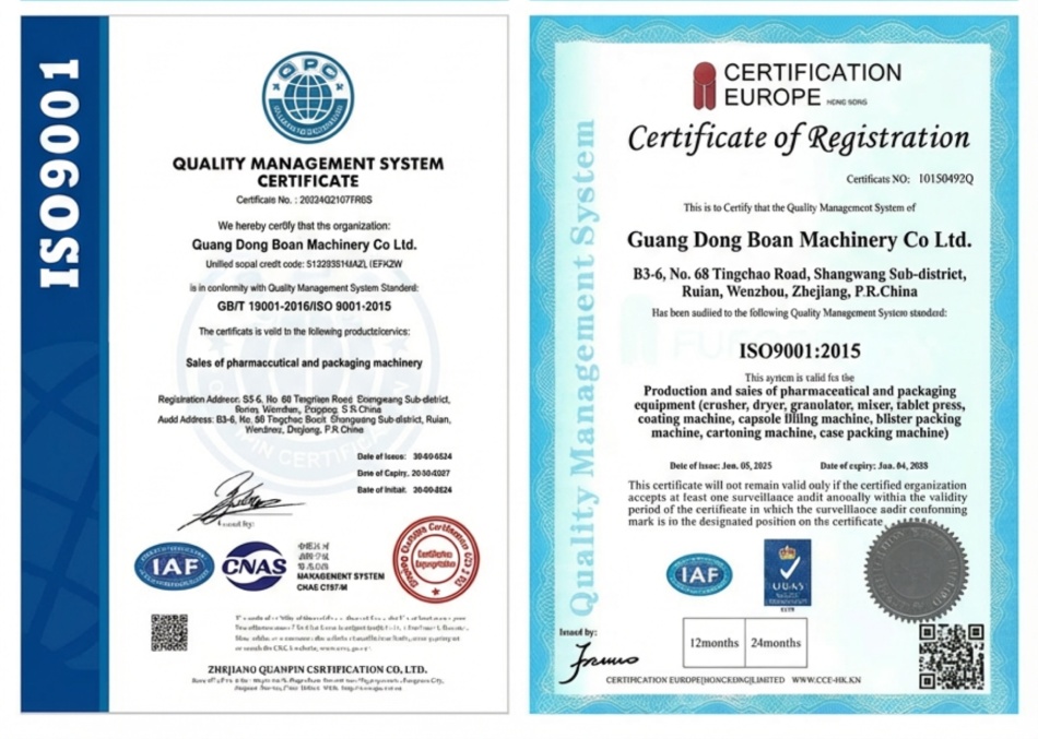 Nuestros equipos se fabrican en estricto cumplimiento con las normas internacionales (GMP, ISO, CE), y cada máquina se somete a pruebas de precisión e inspecciones rigurosas antes de su entrega. Garantizamos un funcionamiento estable, conforme y sin riesgos para su línea de producción.